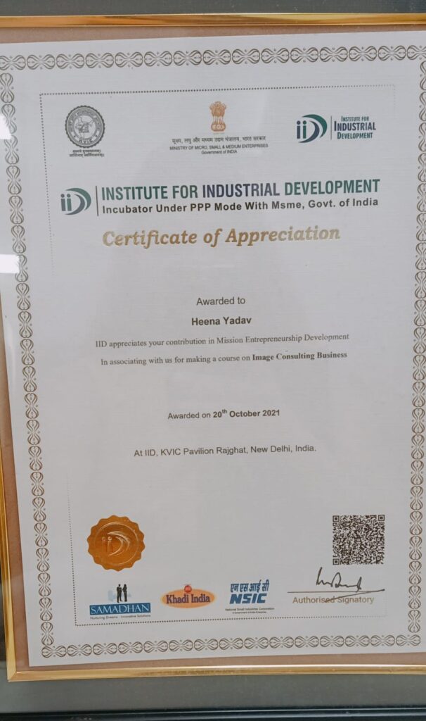 Heena is the only image consultant in India officially affiliated with the Government of India under the Ministry of MSME — where psychology meets presence, and science meets style.